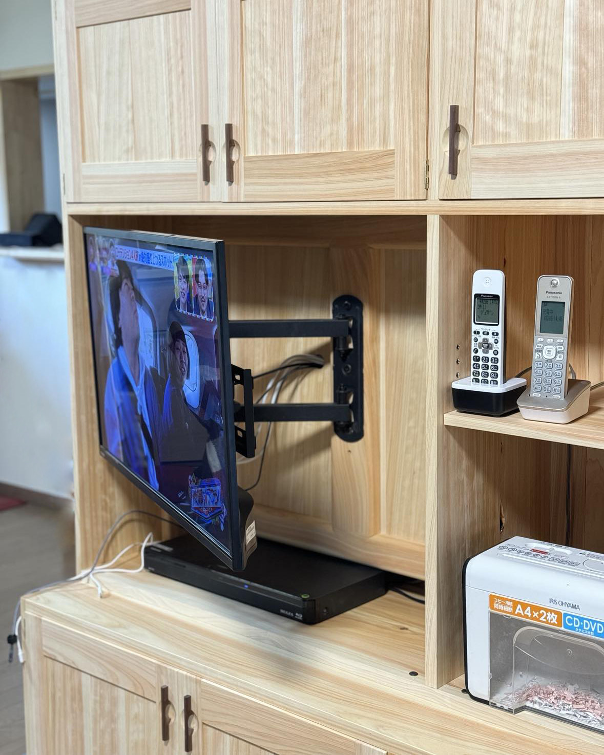 テレビが自由に角度をつけて鑑賞出来る事とキャビネットにスマートに収納できること。